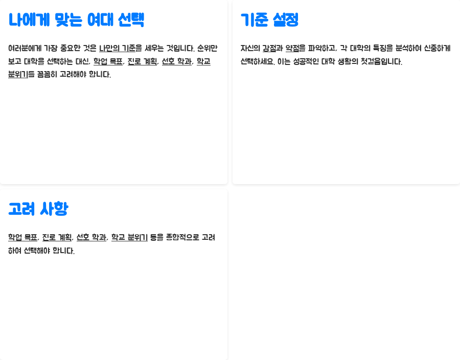 자신의 강점과 약점을 정확하게 파악하고, 각 대학의 특징을 잘 비교 분석하여 신중하게 선택하는 것이 대학 생활의 성공을 위한 첫걸음입니다.