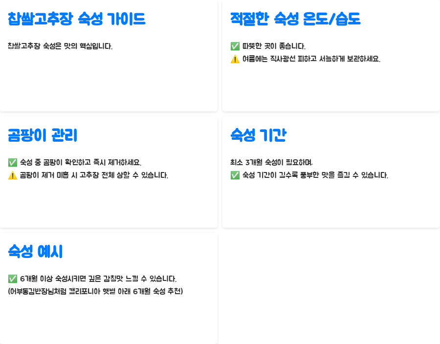 찹쌀고추장의 숙성은 맛의 깊이를 더하는 중요한 과정입니다. 적절한 숙성을 위해서는 온도와 습도 관리가 필수적입니다.